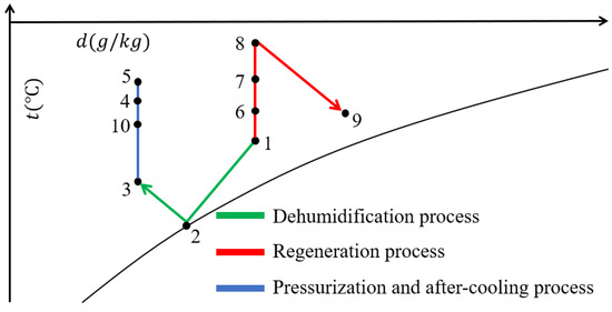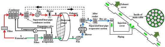 HDS is mainly composed of an HPDS and a DWDS, which includes a dehumidification process, regeneration process, pressurization process and aftercooling process. Figure 2 shows the schematic of the HDS. Figure 3 shows the state of air in HDS. The dehumidification process first cools the air from 1 to 2 in evaporation, which reduces air temperature and moisture content. Then, the air is further dried from 2 to 3 in a desiccant wheel. During the regeneration process, after being preheated by a condenser from 1 to 6, the air enters a heat pipe condenser section, in which it is further preheated from 6 to 7. Then, the preheated air is heated from 7 to 8 in a heater. Finally, the air enters the regeneration area of the desiccant wheel for desorption, as shown in processes 8 to 9. Following dehumidification, the air is pressurized with a blower. During this process, the air is heated from 3 to 5 due to the generated heat from the compressed air of the blower and from the friction of the fan rotor. Then, the air is cooled from 5 to 4 by a heat pipe evaporator and finally cooled from 4 to 10 by an aftercooler. The pressurization system is to provide the power for dry air to flow through the main cable, while the aftercooling system is to cool the high-temperature dry air to below 60 °C to prevent damage to the polyethylene transmission pipeline.