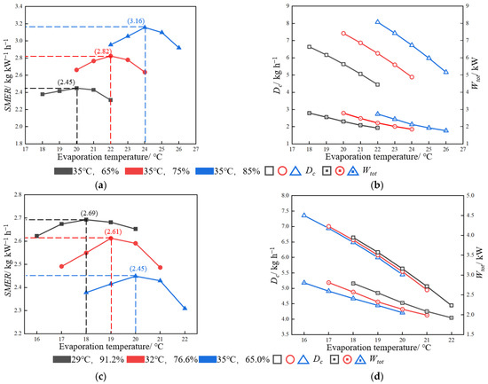 The effects of evaporation temperature on performance. (a) Specific moisture extraction rate (). (b) and . (c) . (d) and .