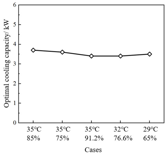 Figure 5 shows the optimal cooling capacity in different cases. Although the inlet air cases are different, the optimal cooling capacity is about 3.5 kW. For structurally defined systems, neither low load operation nor overload operation can optimize the . As a result, for HDS designed in this paper, will be optimal as long as the cooling capacity of the evaporator is controlled to 3.5 kW. This result can be used for the optimal control of HDS in various cases of suspension bridges.