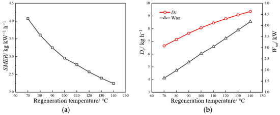 Figure 6a shows the relationship between regeneration temperature and . When the regeneration temperature increases, the decreases. Figure 6b shows the effects of regeneration temperature on and . When the regeneration temperature increases, the increases, but the rate slows down and increases roughly linearly. It could be due to the increment of desiccant wheel temperature, which hinders the mass transfer between air and desiccant. As a result, increased at a slowed rate. HDS can also improve by increasing the regeneration temperature, but the range of adjustment is limited due to the maximum regeneration temperature generally below 140 °C and comes at the cost of high . This is also the problem exposed by the DWDS of the suspension bridge.