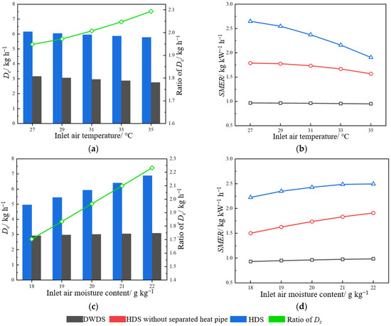 Figure 8 shows and of three dehumidification systems under in inlet air cases. The operating parameters of the three systems are consistent. Process air volume is 400 m3 h−1, the regeneration air volume is 133 m3 h−1 and regeneration temperature is 100 °C. It can be seen from Figure 8a,c that the of HDS is significantly higher than that of DWDS and the ratio of rises up with the increment of inlet air temperature and moisture content. This shows that HDS has better case adaptability than DWDS in high-temperature and -humidity cases of s suspension bridge. It can be seen from Figure 8b,d that, in different air inlet cases, the of HDS is always the highest, followed by the HDS without heat pipe and, finally, DWDS, which reflects the excellent energy conservation of HDS.