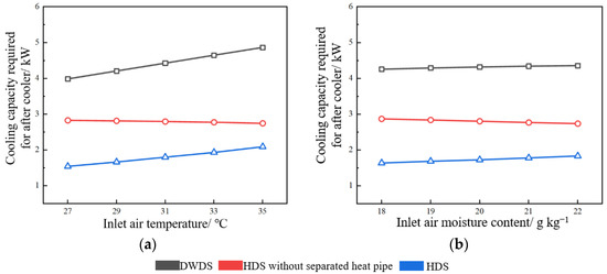 Cooling capacity required for the aftercooler of three dehumidification systems. (a) Inlet air temperature. (b) Inlet air moisture content.