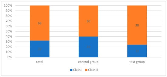 In total, 32 Class I and 68 Class II fillings were placed at baseline, with a ratio of 20:30 in the control group and 12:38 in the test group (Figure 2).
