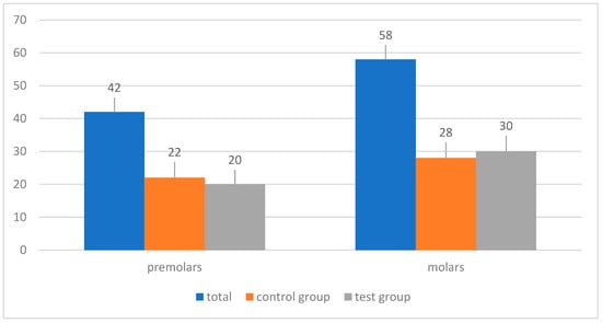 Of the total 42 premolars, 22 teeth and, of the total 58 molars, 28 cavities were assigned to the control group (Figure 3).