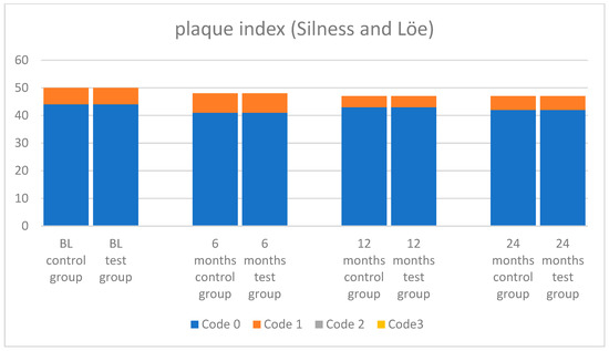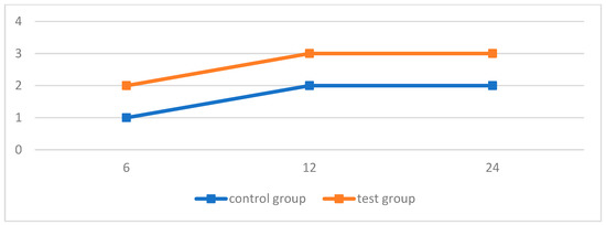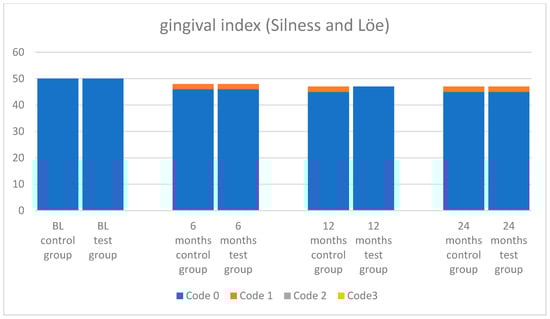 Regarding the plaque index at baseline, six subjects and, after 6 months, seven patients had an index of 1; i.e., a thin plaque film was visible when scraped with a dental probe. This trend of seven study participants continues after 12 months. After 24 months, there is a reduction to five patients showing a plaque index of 1 (Figure 8). In contrast to the plaque index, only two patients showed a gingival index of 1, i.e., low inflammation with slight discoloration of the gingiva without bleeding (Figure 9). After 24 months, no significant difference with regard to PI and GI could be detected between the control and test group (p > 0.05, Mann–Whitney U-test, Table 3).
