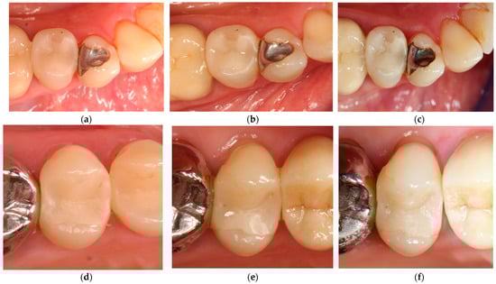 Clinical situation of Pat. No. 16: filling 45 mod without flowable composite: control group, all criteria were rated Code Alpha: (a) baseline; (b) after 12 months; and (c) after 24 months. Clinical situation of filling 15 mod with flowable composite as intermediate liner: test group, all criteria Code Alpha except margin discoloration was evaluated as Code Beta: (d) baseline; (e) after 12 months; and (f) after 24 months.