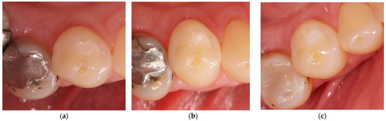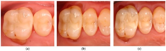 Clinical situation of Pat. No. 6: filling 44 od with flowable composite: test group, all criteria Code Alpha. (a) baseline; (b) after 12 months; and (c) after 24 months.