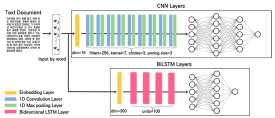 Intel(R) Xeon CPU with 64 GB memory and GeForce RTX 2080 Ti 11GB GPU were used as a hardware system in this environment. Ubuntu OS 22.04 (64 bit) was utilized as an operating system. CUDA Toolkit was installed for Deep Neural Networks to accelerate the deep learning performance. TensorFlow and Keras were applied as a framework of deep learning. FastText (library for efficient learning of word representations and sentence classification) was used as the word vectorization function for word embedding.