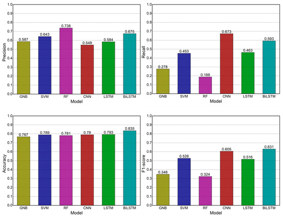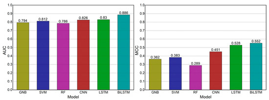 We compare traditional machine learning methods (GNB, SVM, and RF) and deep-learning-based models (CNN, LSTM, and BiLSTM) to test the classification performance of RSTEDocs. Deep learning basically randomly sets the initial weights of the model. Therefore, even if the same data are input to the model, the result may be different each time. Therefore, in order to supplement the reliability of the result value due to the randomness of the weight, each experiment was performed 10 times, and the performance was measured with the mean value. Table 3 presents the performance results (precision, recall, F1 score, accuracy, Area Under the ROC Curve (AUC), and Matthews correlation coefficient (MCC) [34]) of each model. We consider accuracy, F1 score, AUC, and MCC as key metrics for evaluating model performance. The ratio of RSTEDocs and non- RSTEDocs is not equal in the training data. Only about 31% of the total data are RSTEDocs. In this case, even if the classifier is not properly trained, the value of precision increases when most of the documents are judged to be non-RSTEDocs, and the value of recall increases when most of the documents are judged to be RSTEDocs.