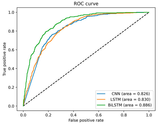 Receiver operating characteristic curves of CNN, LSTM, and BiLSTM.