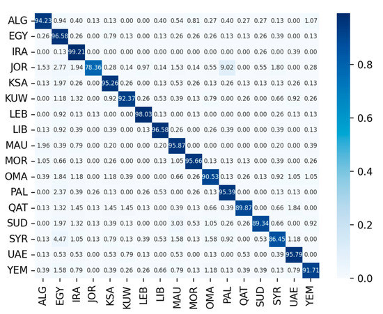 - Shon, S.; Ali, A.; Samih, Y.; Mubarak, H.; Glass, J. ADI17: A Fine-Grained Arabic Dialect Identification Dataset. In Proceedings of the ICASSP 2020—2020 IEEE International Conference on Acoustics, Speech and Signal Processing (ICASSP), Barcelona, Spain, 4–8 May 2020; pp. 8244–8248. [Google Scholar]