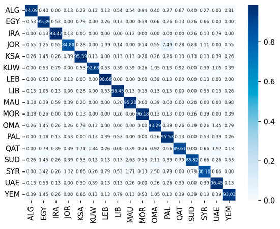 In Figure 5, another poorly performing dialect is SYR, which is most frequently confused with the EGY dialect, accounting for 4.47% of the total confusion pairs. We attribute this to the fact that Syria and Egypt are neighboring countries that merged to form the United Arab Republic in 1958, resulting in frequent communication between the two and possibly language convergence. The ADI17 dataset contains 119.5 h of SYR dialect data and 451.1 h of EGY dialect data. Therefore, when training the model, more emphasis is placed on the EGY dialect, which leads to poorer performance when evaluating the SYR dialect.