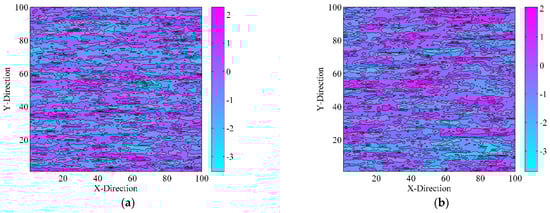 In this paper, the transversely isotropic random field with an exponential correlation structure is studied. Substituting Equation (8) into Equation (9) yields the autocorrelation matrix of transversely anisotropic random fields. According to Equations (10) and (11), an independent standard Gaussian random field HIAG can be obtained by setting μ = 0 and σ = 1. Figure 1 shows a standard normal random field in a 100 × 100 grid, where δ1 = 20 and δ2 = 2, respectively. Given the mean, standard deviation and probability distribution, the independent transversely isotropic standard normal random field HIAG in Figure 1 can be transformed into the desired non-Gaussian field.