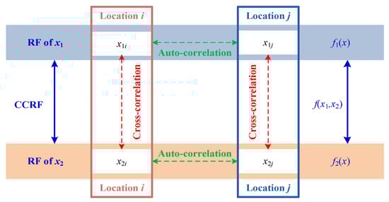 As aforementioned, soil parameters show two types of correlations, namely, autocorrelation and cross-correlation, as demonstrated in Figure 2. The former characterizes the correlation of individual soil parameters at different spatial locations, mainly determined by the autocorrelation structure of the parameter. In this paper, exponential ACF is used to replace it. The latter maintains that soil parameters also tend to be dependent on each other at a given spatial location or neighborhoods, commonly measured by their cross-correlation coefficients. For example, c and ϕ, which are key parameters affecting slope stability, have been proven to be negatively correlated. This implies that c and ϕ should appear dependently in any spatial location. Therefore, to consider the spatial variability and cross-correlation simultaneously, all these parameters should be simulated as cross-correlation random fields, as shown in Figure 2.