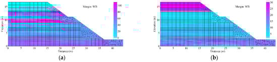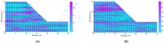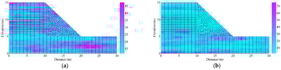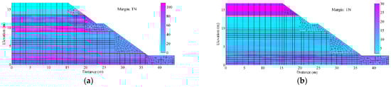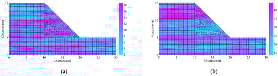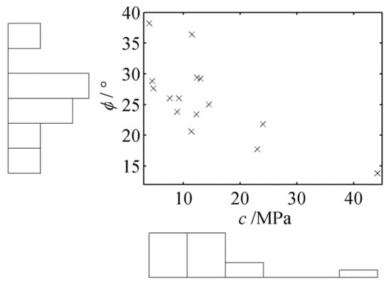 To validate the application of the proposed method, a set of on-site observations of soil parameters in the Papillion River Basin slope, the United States, is adopted []. Figure 25 shows the scatters and corresponding empirical distributions of in-situ data from the Papillion River Basin of Brassica. The statistics are shown in Table 9. The density is assumed as a constant of 17 kN/m3. The effect of the water table is ignored here. To model the Papillion River Basin slope with spatially variable c and ϕ, the same simplified slope geometry as that in Section 6 is used here.