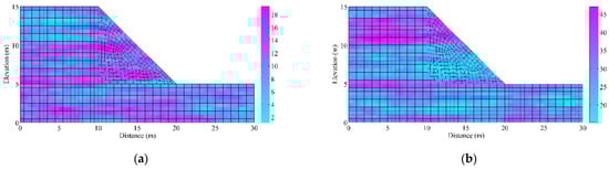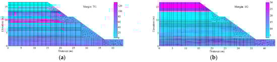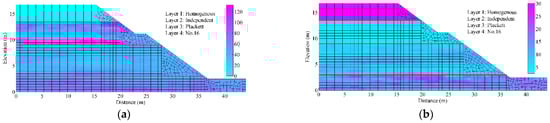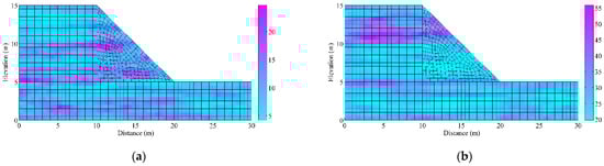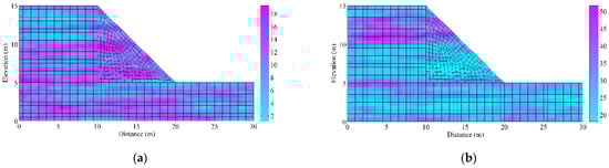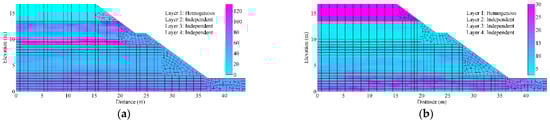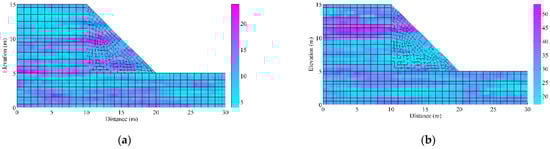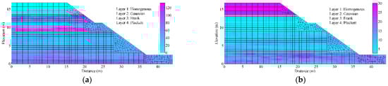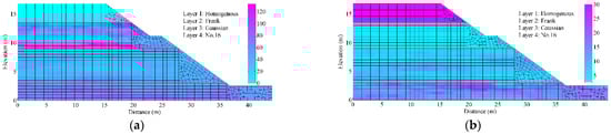 Figure 4, Figure 5, Figure 6 and Figure 7 respectively display the typical realizations of CCRFs associated with four candidate copulas. In the subfigures of the slope geometry, the depth of mesh color represents the magnitude of soil parameters. Namely, the deeper the color, the larger the value of c or ϕ. It is evident that spatially variable soil properties can be efficiently demonstrated by the CCRF models. Soil parameters c and ϕ develop smoothly in the horizontal direction, but fluctuate severely in the vertical direction. This is mainly attributed to the domination of SOFs δh and δv. As δv is much smaller than δh (2 m vs. 20 m), c and ϕ fluctuate more severely in the vertical direction than in the horizontal direction, further indicating the reasonable characterization of spatial variability. In addition, it can also be clearly observed from Figure 4, Figure 5, Figure 6 and Figure 7 that as c develops a deeper color, the corresponding ϕ in the same location develops a lighter color, and vice versa. This indicates that a negative cross-correlation exhibits between the two random fields.
