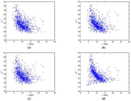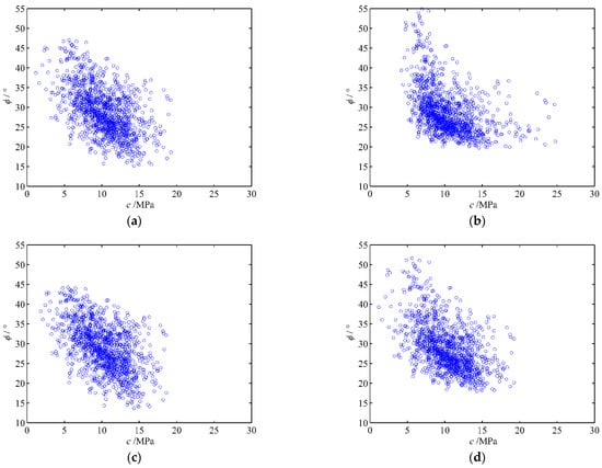 Fortunately, similar but limited efforts have been undertaken by some scholars [,,]. Fenton and Griffiths [] decomposed correlation matrices of parameters by Cholesky decomposition, and then simulated the cross-correlated random field (CCRF) using lower triangular matrices. Cho [] assumed that all random fields have similar autocorrelation, and then used the cross-correlation coefficient to characterize the CCRFs of c and ϕ. However, according to probability theory, correlation coefficient cannot accurately represent the correlation structure among random variables. Such treatment obviously does not cater to the real spatial distribution of soil parameters. More efforts must be made to describe the correlation problem involving multiple-parameter random fields.