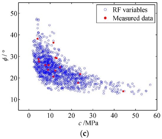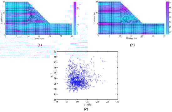 In this section, a transversely anisotropic CCRF of the studied slope is constructed. It can be concluded from the previous section that the optimal margins of c and ϕ adopt the LN distribution. The optimal model representing the dependent structure of c and ϕ is the Gaussian copula. According to Algorithm 1 applied to the Gaussian-based CCRF proposed in Section 4, a transversely anisotropic CCRF can be generated. A typical realization of this is shown in Figure 26. As expected, the spatial variability and cross-correlation of soil parameters can be successfully reproduced. The RF variables are distributed similarly to the measured data and can cover them well, demonstrating the efficiency of the proposed method.