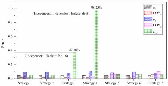 Table 8 gives the statistics of multi-layer CCRFs associated with seven strategies. The corresponding average errors of the statistics with respect to three clay layers are shown in Figure 24. It can be seen that the average comprehensive errors of the seven cases are 4.62%, 4.96%, 10.72%, 23.87%, 6.47%, 5.96% and 7.14%, respectively. The statistics deduced by copula-based CCRF are basically consistent with the real values shown in Table 6. This demonstrates the accuracy of the proposed method in modeling multi-layer CCRFs for spatially variable soils. Notably, strategies 3 and 4 show a relatively high bias. This can be explained by the huge errors in the estimated ρc,ϕ values, as shown in Figure 24. In Strategy 3, the soil parameters of clay layer 1 are assumed to be independent variables, and yield 37.48% bias. This value under strategy 4 reaches 98.45% due to the neglect of dependent structures in all three clay layers. It can be concluded that ignoring the interdependency of soil parameters in the arbitrary layer of the slope would lead to significant deviation. Such bias would rapidly expand, as more faulty operations take place.