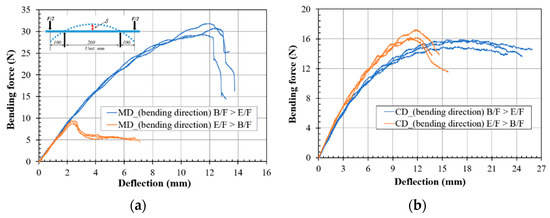 The results of the four-point bending test are shown as the bending force (F)–deflection (δ) curve of the MD and CD in Figure 5. Here, δ is the deflection of the specimen at the central span, which is one-third of the crossed-head movement of the universal testing machine [10]. In this figure, when E/F > B/F, the E/F side becomes tensile and the B/F side becomes compressed, whereas when B/F > E/F, the B/F side becomes tensile and the E/F side becomes compressed.