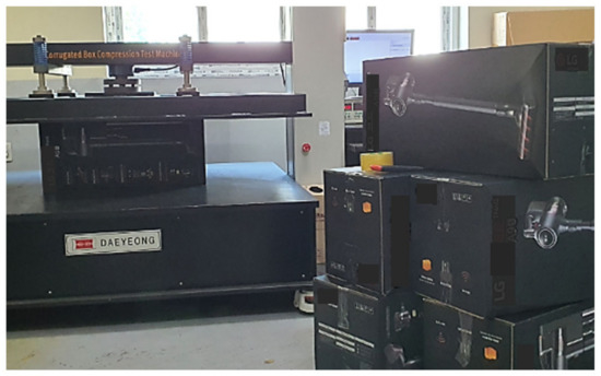 The box compression test (BCT) was performed at room temperature (Figure 6) after pretreating the sample for 72 h or more under two conditions: (1) temperature of 40 °C at an rh of 50%, and (2) temperature of 40 °C at an rh of 90%. The test followed the ISO 12048 [18] specification and was conducted at a test speed of 10 mm/min for a box with a size of 730 × 293 × 336 mm based on the outer dimensions. The box sample used in the BCT was made with a target corrugated fiberboard and was a regular slotted container (RSC) with a size of L × W × D = 730 × 293 × 336 mm based on the outer dimensions.