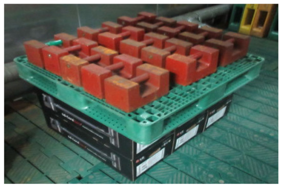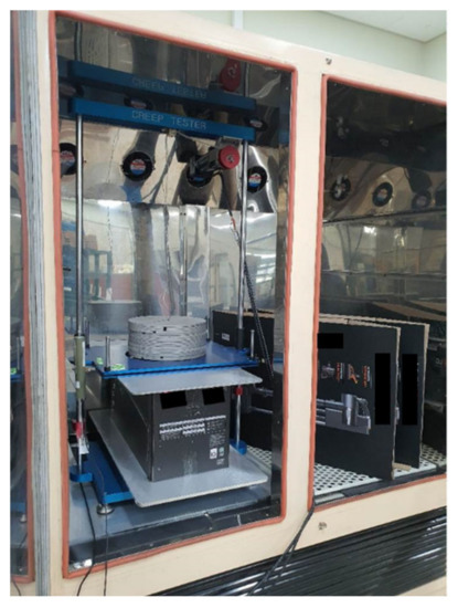 As shown in Figure 8, the box creep test was conducted for 72 h with a compression load of 0.8338 kN (approximately 41% of the box compression strength under the same conditions (Figure 7)) at a temperature of 40 °C and an rh of 90%, considering the extreme distribution conditions of the target corrugated package. The sample used was the same as that used in the BCT, and the test followed the ASTM D7030 [19] specifications.