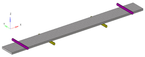 Similar to the test specifications [17] shown in Figure 5a, the four-point bending FE model is shown in Figure 10. The size of the model was 50 mm × 500 mm, with a thickness of 5 mm, which was the same as those of the specimen used in the test. The element size of the corrugated fiberboard specimen was 5 mm, and it was composed of a continuum shell element to predict the changes over time. The number of nodes and elements in the four-point bending FE model was 2222 and 1000, respectively. In addition, the models of loading and supporting anvils were modeled to be similar to the actual size and shape of the jig (cylinder radius: 3.18 mm; length: 84 mm) during the test and consisted of rigid elements with a size of 2 mm. In the FEA, contact was defined between the corrugated fiberboard specimen and jigs, and the coefficient of friction was determined to be 0.4. For the boundary conditions, the lower supporting anvil was fixed and the upper loading anvil was forcibly displaced in the z-direction. The forced displacement was 15 mm for the CD and 5 mm for the MD, and these values were defined as the average values that could be estimated as linear intervals, regardless of the bending direction of the curves of each specimen’s direction, as shown in Figure 5.