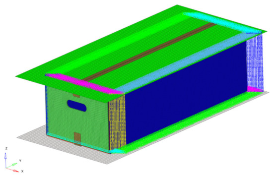 FEA was performed in two stages: after performing a static analysis (implicit dynamic quasi-static analysis) that applied the load to the stacking FE model (for example, in Case 1 of Table 4, the number of nodes = 669,900 (111,650 × 6), and the number of elements = 334,992 (55,830 × 6)) (Figure 13), which consisted of six BCT FE models as shown in Figure 11, the FEA of the creep behavior (Visco) was performed for 72 h. Surface-to-surface contact was defined between the boxes. Park et al. [20] reported that the coefficient of friction between corrugated fiberboards with the same paper combination and flute shape is not significantly different depending on the contact direction, and the static frictional coefficient between corrugated fiberboards with a paper combination similar to that of the target corrugated fiberboard used in this study was approximately 0.38 (±0.01). Therefore, in this study, the coefficient of friction was determined to be 0.4 without considering the contact direction between the boxes in the FE model, as shown in Figure 13.