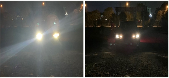 Figure 1 illustrates our adjustable polarizing flip plate and headlight filters. Figure 2 shows the LED headlights on the left, which presented significant glare, whereas the headlight on the right was attached with a set of polarizing filters and thus exhibited much less observable glare. Figure 3 presents the polarizing equipped headlights, observed with and without the polarizing flip plate, demonstrating a further reduction in glare when using the flip plate. From Figure 2 and Figure 3, we can see a drastic diminishing of glare. This is a satisfactory result, albeit qualitative.