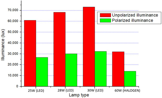 As discussed by Land, the use of polarized headlights increases a driver’s visibility of pedestrians [20]. Furthermore, according to a study by Hemion [23], the use of polarized headlights also increases the detection distances compared to the traditional system. It should be noted that the headlights used by Land and Hemion were halogen lamps. In this study, we determined that unpolarized LED headlights have a lighting distance of 155 m and 115 m when polarized. The halogen system’s lighting distance was similar at 110 m. It is also worth mentioning that these measurements are taken from headlights in high-beam mode. Additionally, we believe that our polarized system’s low-beam performance is akin to that of the halogen system, judging from their similar high-beam lighting distances. Regardless, further study into beam configurations is needed to quantify their impact on illumination distances. Since our modern polarized LED system possesses superior illuminance, a lower power rating, and comparable high-beam illumination distances to halogen lamps, this combination makes them well-suited for automotive lighting.