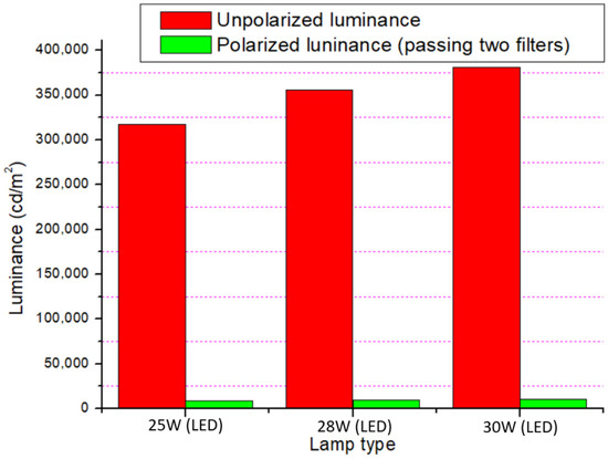 Luminance measurements of LED headlights with different powers (25 W, 28 W, and 30 W). Polarized luminance measurements were taken after light passed through only the headlights’ polarizing filter.