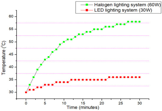 Figure 8 shows the temperature measurements of the polarizing filters in the halogen and LED lighting systems. According to this figure, it is apparent that the filter’s temperature in the halogen system increased by nearly 30 °C, whereas the LED filter only experienced a 5 °C increase over the same period. Because of lower temperatures, the polarizing filters in the LED lighting system will have a significantly higher operating lifespan. To approximate the lifespan improvements of our LED system, we utilized Arrhenius’ equation [31]: