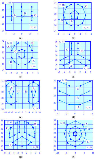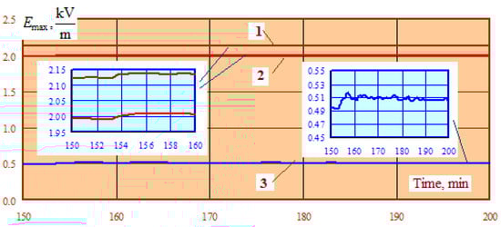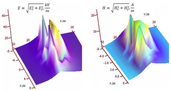 - The maximum amplitudes of the electric field (EF) of all the considered COHLs, except for the line with a vertical arrangement of wires, exceeded similar values for a standard power transmission line. The largest, fourfold, difference took place in the case of a three-segment COHL. However, the levels of EMF strengths for all the considered COHL designs did not exceed the permissible limits. Exceeding these limits only occurs when operating on a transmission line without de-energizing it (Figure 14).