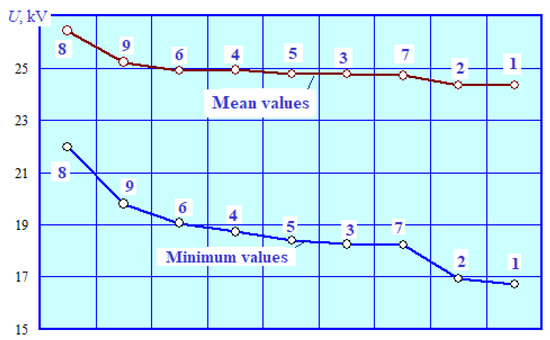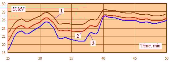 - Voltages on bow collectors of electrical rolling stock increased and stabilized (Table 1 and Figure 15). In the computational examples with a standard feeding line, voltage on the bow collector of the first train decreased below the permissible limit, and when using a three-segment COHL design it increased to 22 kV;