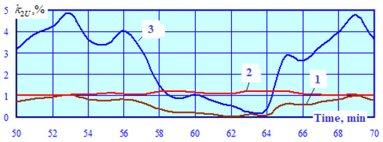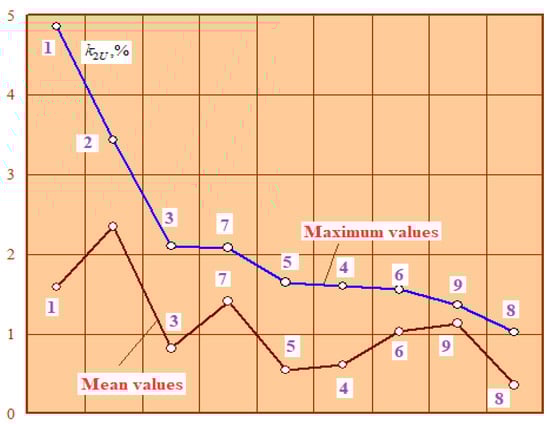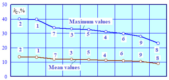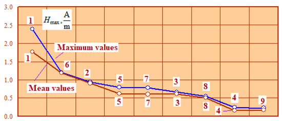 - We observed the damping effects of COHLs, which manifested themselves as the reduction of field variability. The variation coefficients of EMF strengths for all of the considered COHLs were lower than those of the standard line (Figure 23). The maximum difference was observed for the double coaxial COHL and reached seven times. MF variability that was less than in the standard line took place in the case of the following designs (Figure 24): three- and two-segment lines, coaxial double lines, and a line with a vertical arrangement of conductors.