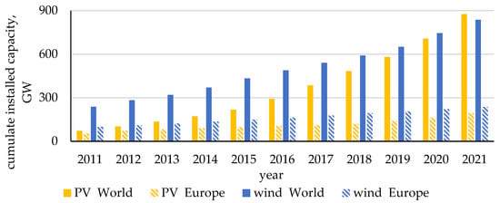 For years, wind power has ranked highest in terms of volume of energy generation among renewable energy sources. In terms of installed capacity, it was only in 2021 that the installed capacity of photovoltaics globally exceeded the installed capacity of wind turbines []. Figure 1 presents the cumulative installed capacity in the period of 2011–2021 for wind energy and PV [].