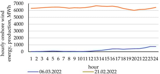 Energy generation from onshore wind in Poland is characterized by high temporal variability; as an example, hourly data from the day with the highest energy production in the first half of 2022 (21 February) and the lowest one (6 March) were selected (Figure 2). In the first interval, hourly energy production was higher than 6000 MWh, and in the second period, hourly energy production for the first half of the day did not exceed 100 MWh. At that time, the total installed wind power capacity in the Polish electricity system was about 7.8 GW—onshore and offshore had not been installed until now (data as of February 2023).
