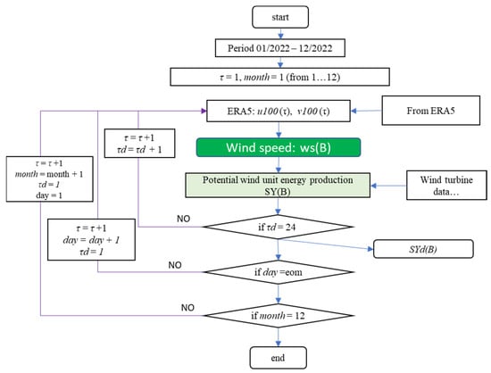 Equations (1)–(4) were included in the methodology for calculating the potential offshore wind energy shown in Figure 3. There are three loops: daily, monthly, and yearly. Based on several outputs, mainly wind speed data, the main result is calculated as the daily specific yield (in unit of kWh/kW/day).