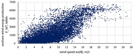 In recent years, wind energy has become one of the cheapest sources of electricity in terms of Levelised Cost of Electricity [,]. Installed cost reduction of technology as well as technology development is being observed nowadays. This, together with implemented support systems for renewable energy development, has resulted in significant increases in the installed capacity of renewable sources, including wind energy, in Poland and in other countries []. The increasing share of electricity generated from these sources has influenced the electricity market and prices in this market. Electricity generated from today’s RESs has an impact on the stabilization of electricity prices in the wholesale market [,,]. In Poland, during days when the value of energy generation from onshore wind turbines is close to or above half of the installed capacity—about 8 GW from onshore wind installed already—the market price of the power exchange is significantly lower than on other days []. This is also apparent when the value of the share of wind-generated energy exceeds 20% of the daily energy production []. At the same time, this technology only contributes to a certain extent to ensuring that the power demand of the electricity system is met. In addition, wind energy production is unpredictable due to weather conditions, but it is nevertheless possible to make estimates on a different time scale in terms of its quantity.