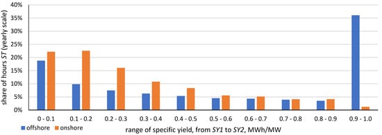 For the Masovian region, 57% of the wind speed hours were lower than 6 m/s; for Slawno it was 41%, and for offshore it was 27%. For wind speeds in excess of 12 m/s for the offshore region, it was more than 2000 h, for Slawno it was 600 h and for the Masovian region it was only 250 h. By applying the results to hourly wind-specific yield, a comparison in the format of share of time ST was obtained (Figure 7).