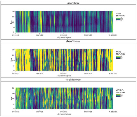Hourly value of: (a) real wind energy productivity for onshore wind SY(P); (b) theoretical offshore wind energy productivity, SY(B); (c) difference of wind offshore and onshore energy production—specific yield (dSY).