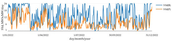 The highest hourly productivity for offshore wind would occur in the first months of 2022. A similar situation occurred for onshore wind turbines. Significantly, the smallest differences in hourly productivity would occur in the summer of 2022. The results from Figure 8 aggregated to daily totals (based on Equations (4) and (6)) are depicted in Figure 9.
