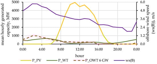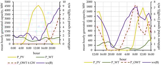In addition, calculations were made for selected days in 2022. Sample energy production calculations (from onshore and offshore wind, and also photovoltaic) for 5 March 2022 and for 1 August are given in Figure 10.