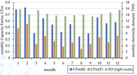 Capacity Factor and monthly electricity demand values in monthly scale in 2022 (Poland). Source: own calculation based on [,].