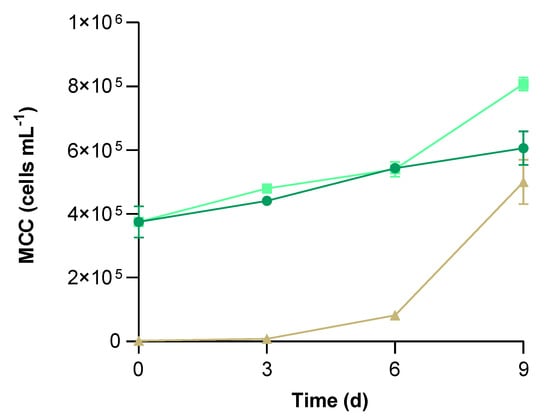 The microalgal biomass was monitored and quantified over time. For each reactor, samples of 100 μL were taken on days 0, 3, 6, and 9 in duplicate, and biomass was quantified in duplicate by microscopic determination of the MCC using a Neubauer chamber (LEICA, DMLB, and Blau Brand, Steinheim, Germany).