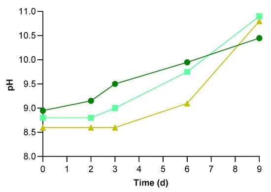 The pH variations were plotted over time (Figure 4). In the CV and C+ PBRs, the pH values started to increase on day 2, while in the C− PBR, it only occurred on day 3, along with microalgal growth. In contrast with the present study, a pH decrease was reported in photobioreactors with other microalgal species described as hyperproducers of humic acids, such as Euglena sp. []. The co-production of other acid compounds such as itaconic acid by these microalgae was responsible for the pH decrease in such photobioreactors []. In the present study, the observed pH increase was probably due to the photosynthetic process. As microalgae consume CO2, a cell internal conversion of HCO3− occurs to be further used as a carbon source for photosynthesis. This process leads to the accumulation of OH− in the cells; to neutralize these ions, an increase in H+ uptake from the culture medium occurs, leading to a cell-external increase in pH []. The correlation between the microalgal growth and pH is supported by the exponential growth of microalgal cells and pH increase in both the C+ and C− PBRs, and the stationary phase of C. vulgaris between days 6 and 9.