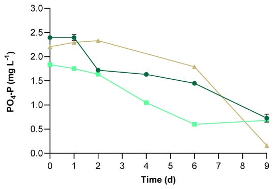 As with any other living organism, microalgae are mainly composed of C, N, and P, typically with molar ratios C106H181O45N16P []. Consequently, the assimilation mechanisms of these elements are linked []. Hence, the advantages of using microalgae-based treatments is the capacity of these organisms to remove conventional pollutants, such as phosphates, nitrates, and COD, frequently detected in the final effluents of conventional UWWTPs, at concentrations up to 40 mg L−1 of total phosphorus, 30 mg L−1 of NO3–N and 160 mg O2 L−1 of COD, respectively [,,]. To confirm this ability, variations of PO4–P concentration over time were registered (Figure 5), and the phosphorus MR and RE were calculated (Table 3) after 9 d of the microalgal treatment. Variations in the N–NO3- concentration were not determined because their content in the initial wastewater was already below the detection limit (0.2 mg L−1).