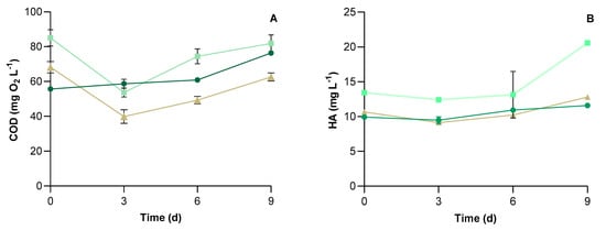 Variation of chemical oxygen demand (COD) (A) and humic acid (HA) (B) concentration (average ± standard deviation) over time (d), expressed in mg O2 L−1 and mg L−1, respectively, for each PBR: ■ CV (C. vulgaris + UWW); ■ C+ (C. vulgaris + autoclaved UWW); and ■ C− (raw UWW).