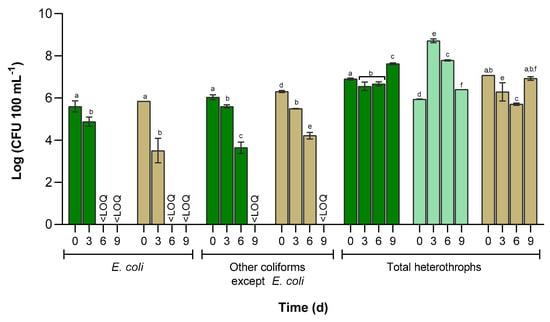 Quantification of E. coli, other faecal coliforms except E. coli, and total heterotrophs over time (d) for each PBR: ■ CV (C. vulgaris + UWW); ■ C+ (C. vulgaris + autoclaved UWW); and ■ C− (raw UWW). Results are expressed in log (CFU 100 mL−1) (average ± standard deviation). Bars from the same group of bacteria with a common superscript letter are not statistically different (two-way ANOVA followed by Tukey post hoc test p > 0.05).