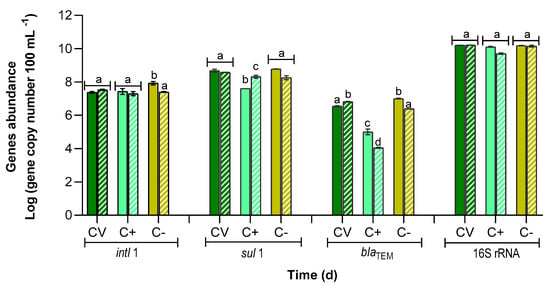 The abundance of the 16S rRNA, intl1, and antibiotic resistance genes (sul1 and blaTEM) detected in each PBR: ■ CV (C. vulgaris + UWW); ■ C+ (C. vulgaris + autoclaved UWW); and ■ C− (raw UWW), at the beginning of the experiment (full colored bars) and after 9 d of treatment (striped bars). Results (average ± standard deviation) are expressed in a log (gene copy number 100 mL−1). Bars of the same gene with the same letters are not statistically different (two-way ANOVA followed by Tukey post hoc test p < 0.05).